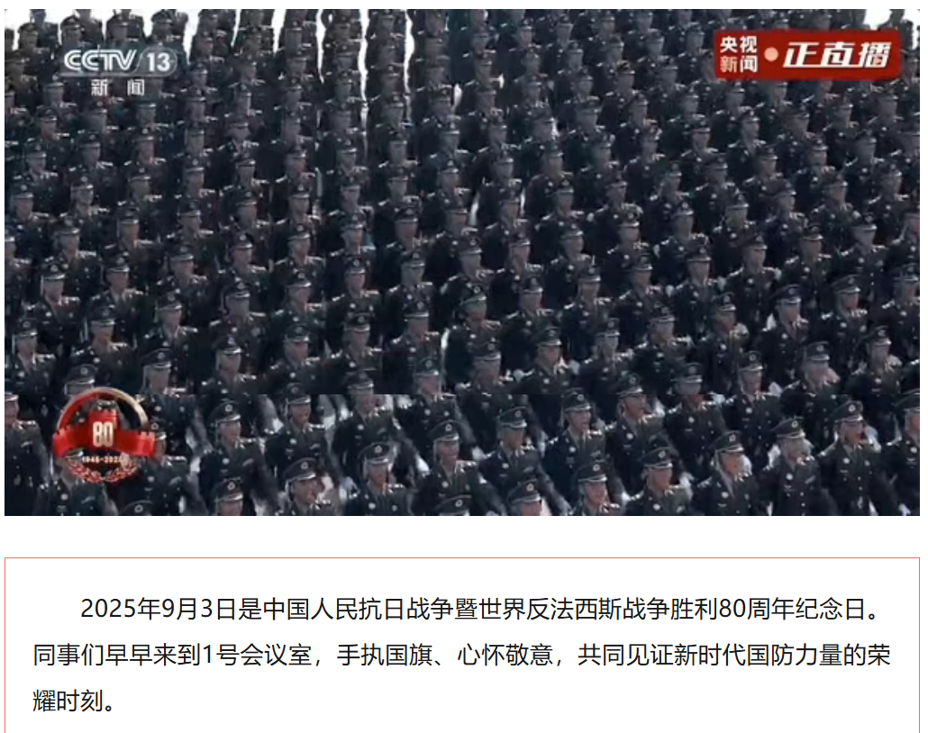 2025年9月3日是中國(guó)人民抗日戰(zhàn)爭(zhēng)暨世界反法西斯戰(zhàn)爭(zhēng)勝利80周年紀(jì)念日。同事們?cè)缭鐏?lái)到1號(hào)會(huì)議室,手執(zhí)國(guó)旗、心懷敬意,共同見(jiàn)證新時(shí)代國(guó)防力量的榮耀時(shí)刻。
